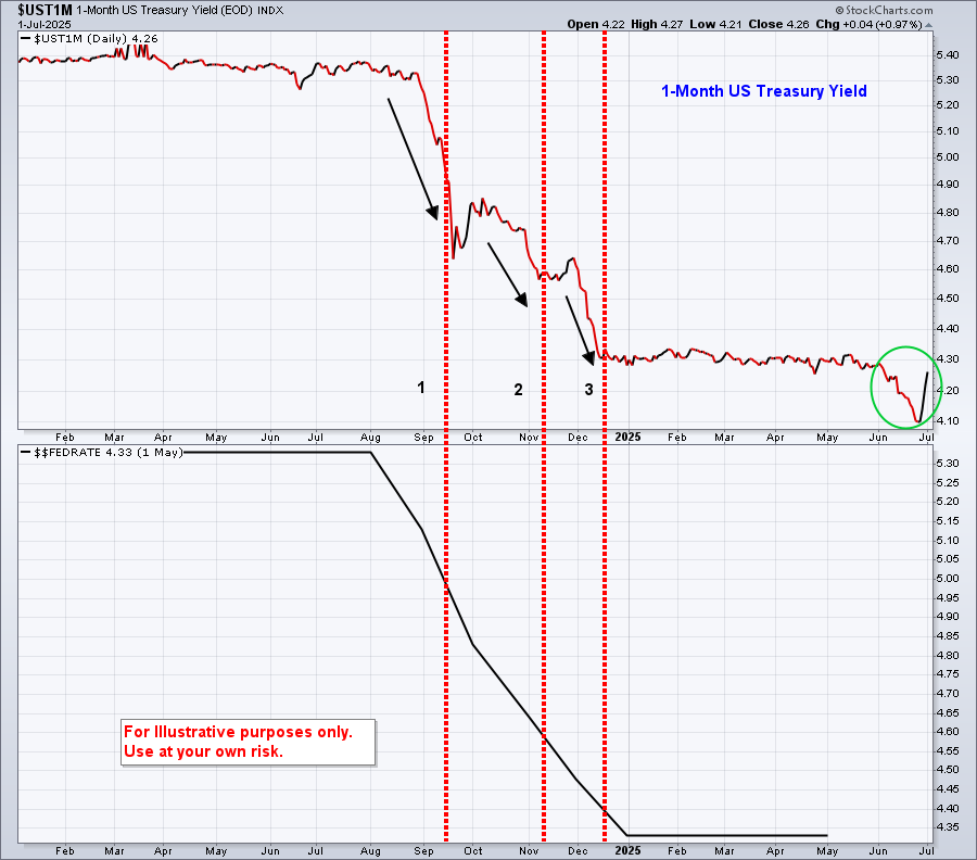 A good indicator of what Wall Street expects is the yield of the 1-month US Treasury. The fall of 2024 was the last time rates were cut, and the chart below of the 1-month Treasury yield shows that yields began falling before each of the three cuts.